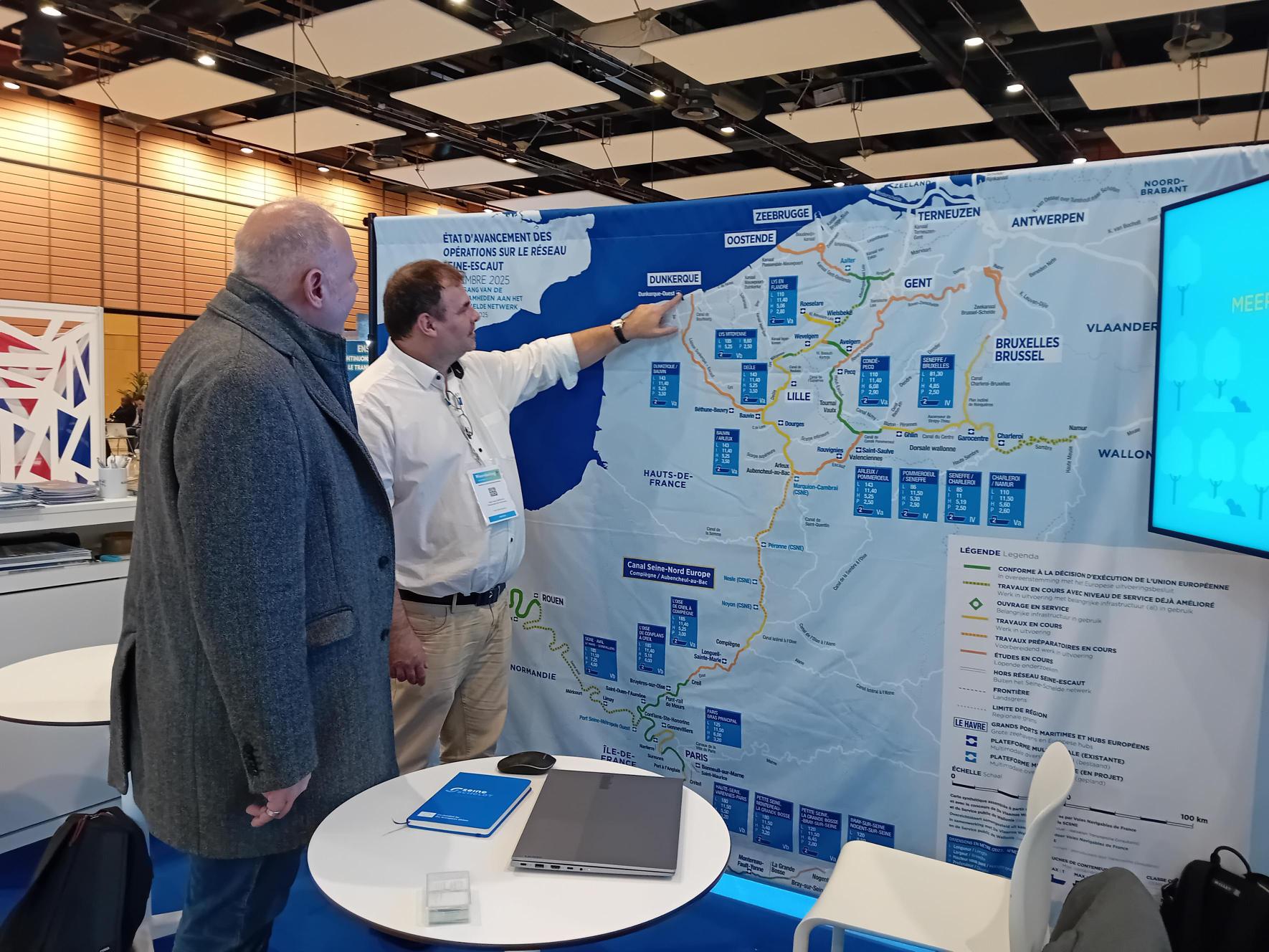 Sur le stand du GEIE, les représentants de De Vlaamse Waterweg nv, du Service public de Wallonie, de la Société du Canal Seine-Nord Europe et de VNF ont pu échanger avec les professionnels du secteur fluvial sur les avancées concrètes du Canal Seine Nord Europe et de la modernisation des voies navigables en France, en Flandre et en Wallonie, ainsi que sur les perspectives à venir et les services que le Réseau Seine-Escaut met à leur disposition.